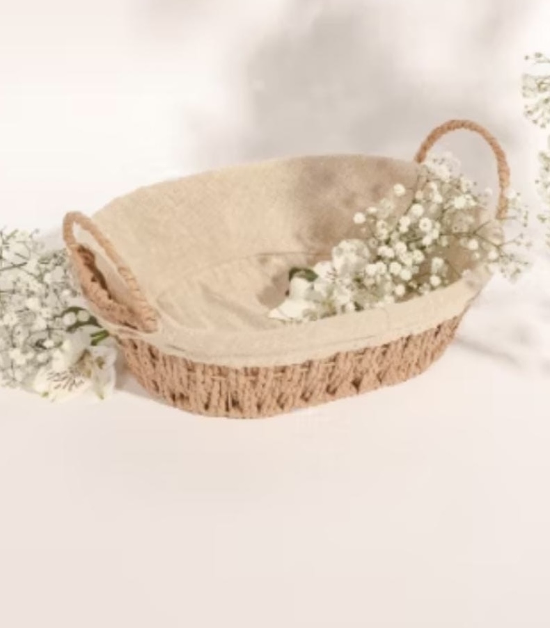 Cesta em formato oval, feita de papel com forro em tecido, removível para facilitar a limpeza.