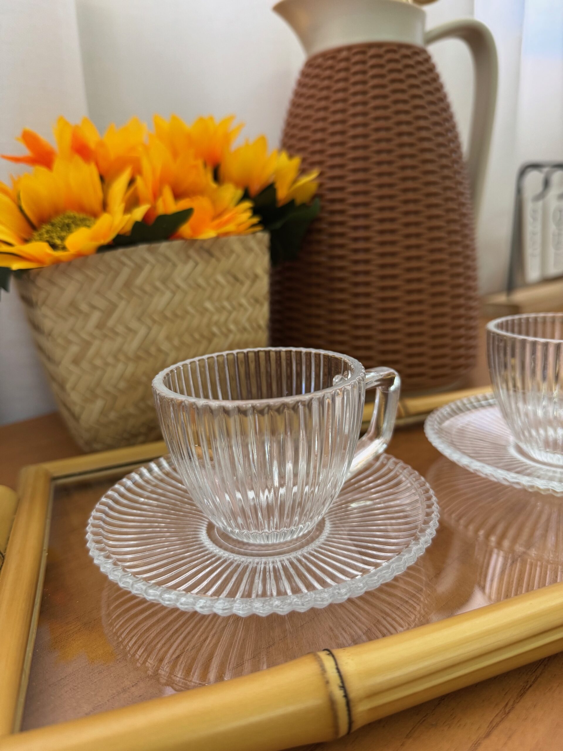 Conjunto composto por 6 xícaras de café com pires, de vidro, com detalhes em alto relevo na parte externa da xícara e do pires.