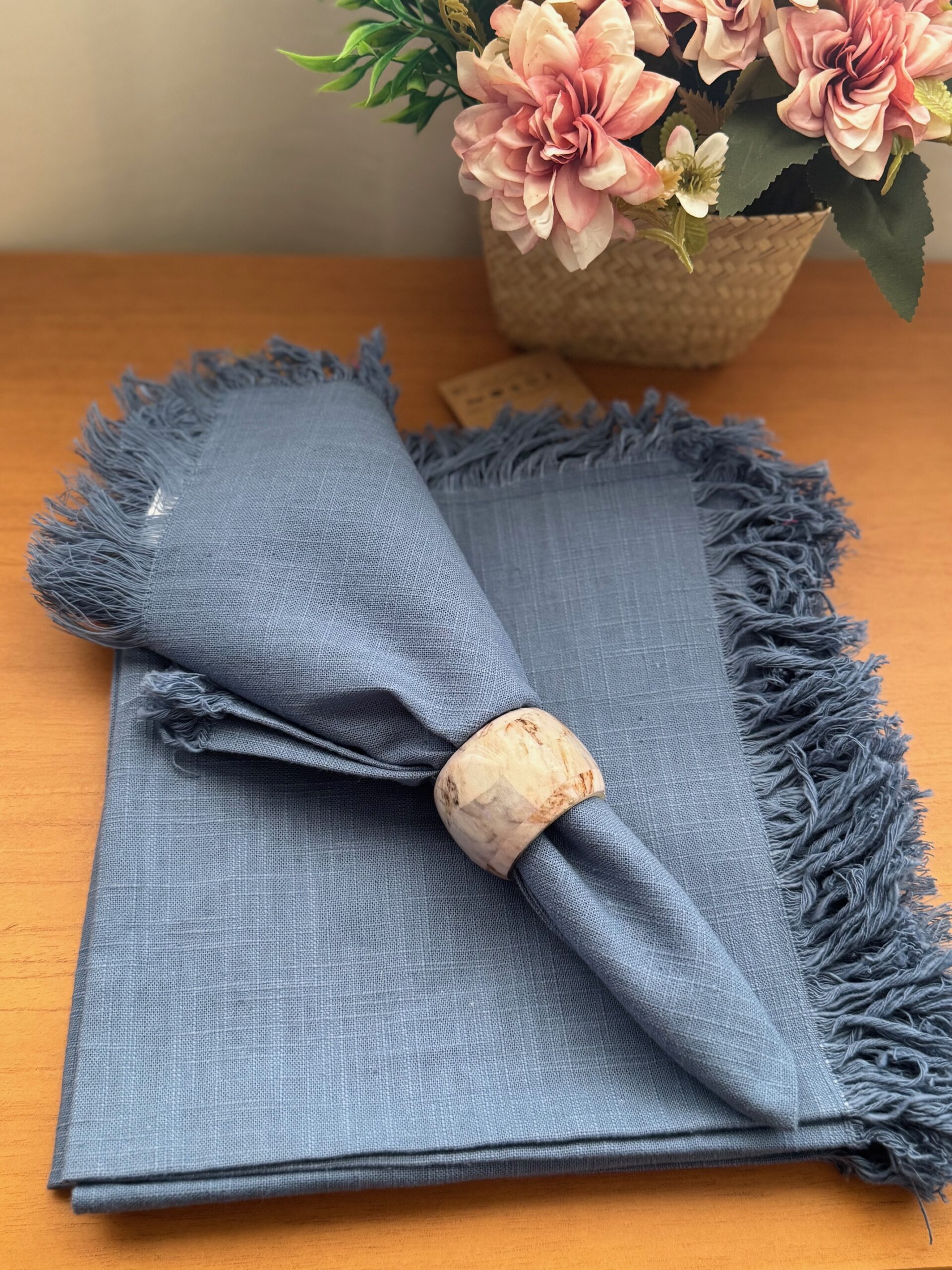 Guardanapo feito de linho na cor azul com bordas de franjas. Ideal para deixar a sua Mesa posta elegante!