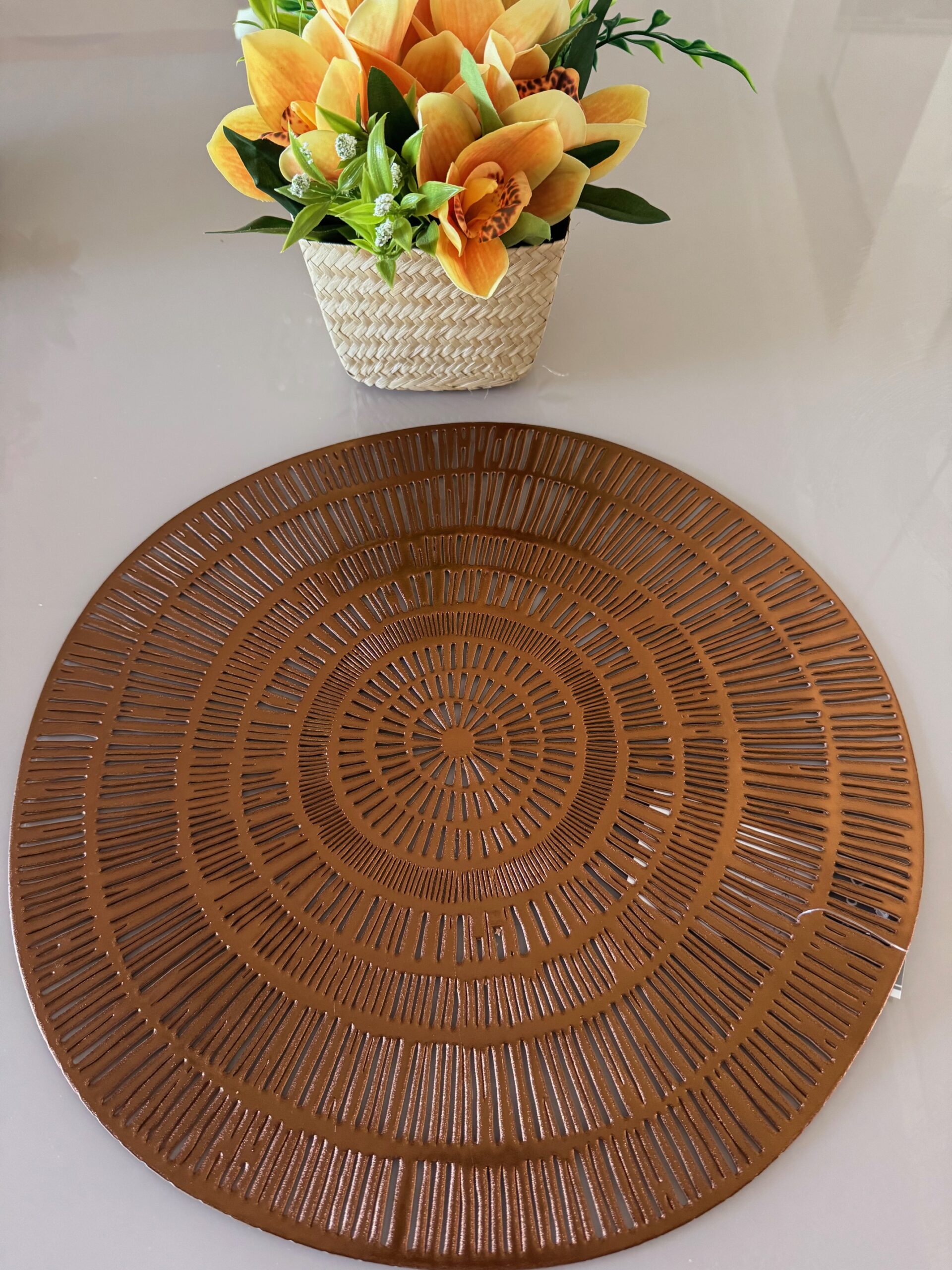 Lugar americano redondo feito de PVC, marrom , fácil de limpar. Ideal para proteger e embelezar a sua Mesa.
