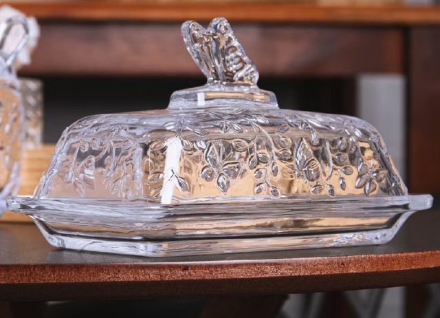Manteigueira feita de cristal ecológico, com detalhes em alto relevo de borboletas e flores.Possui tampa de cristal com puxador de borboleta.