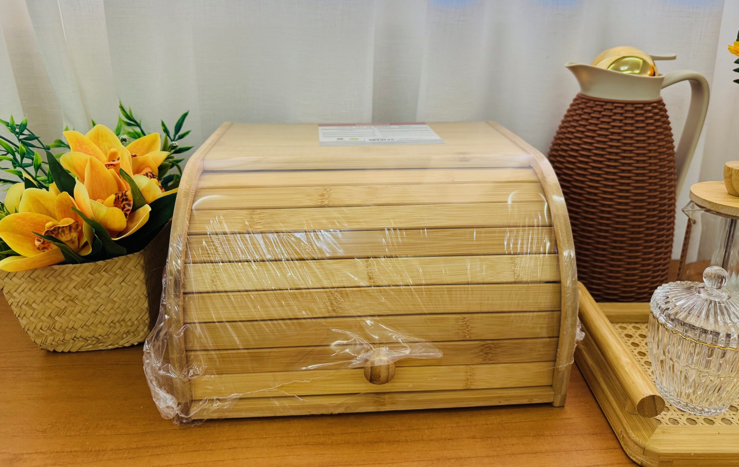 Porta Pão feito de bambu com tampa retrátil de bambu. Perfeito para armazenar pães, biscoitos, com praticidade e beleza. Além de armazenar decora a sua cozinha.