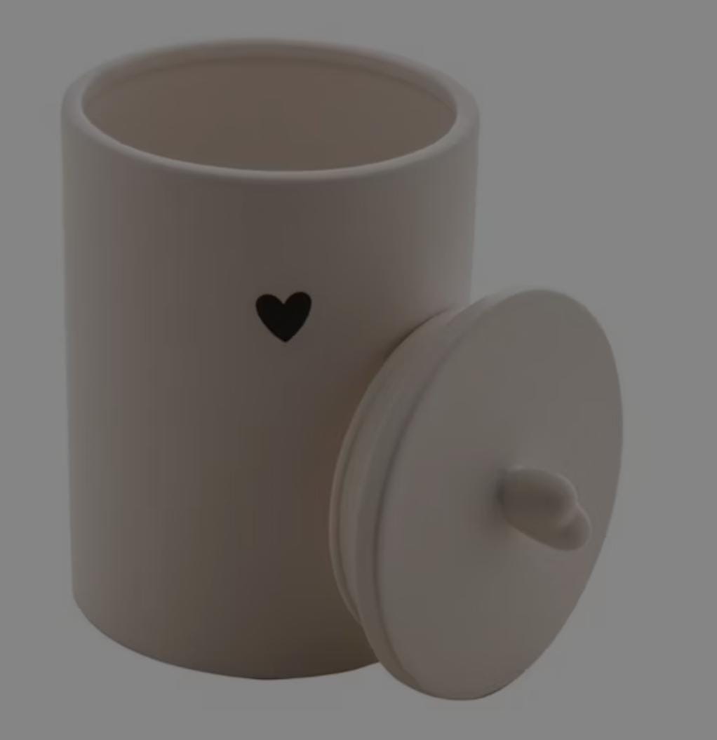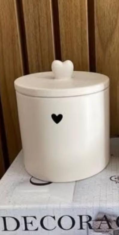 Potiche feito de cerâmica branca com detalhe coração preto, possui tampa e puxador em formato coração. Perfeito para organizar e decorar!