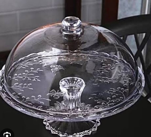 Prato para bolo feito de cristal ecológico, com pé e tampa de cristal. Possui detalhes em alto relevo no prato e tampa feita de cristal.