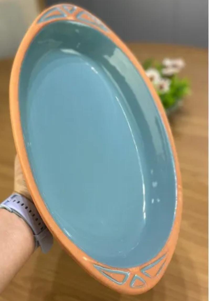 Refratário feito de cerâmica oval , na cor azul turquesa , com detalhes nas alças. Design que mistura o rústico com o moderno. Pode ser levada ao forno.