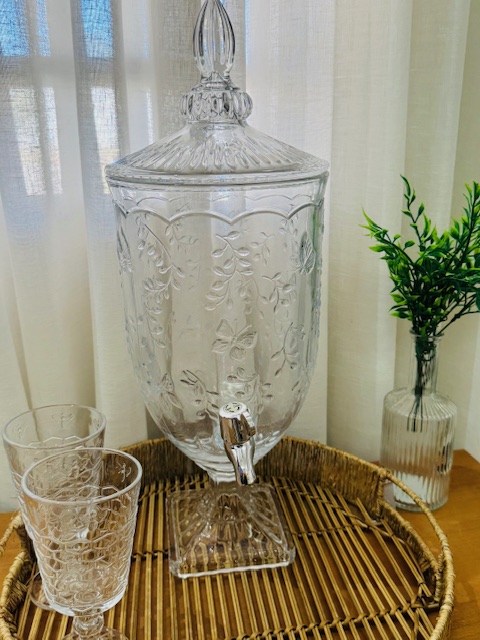 Suqueira elegante e funcional, feita de cristal ecológico. Possui detalhes em alto relevo de borboletas e flores e tampa de cristal. Ideal para servir sucos, refrescos, águas saborizadas e encantar seus convidados.