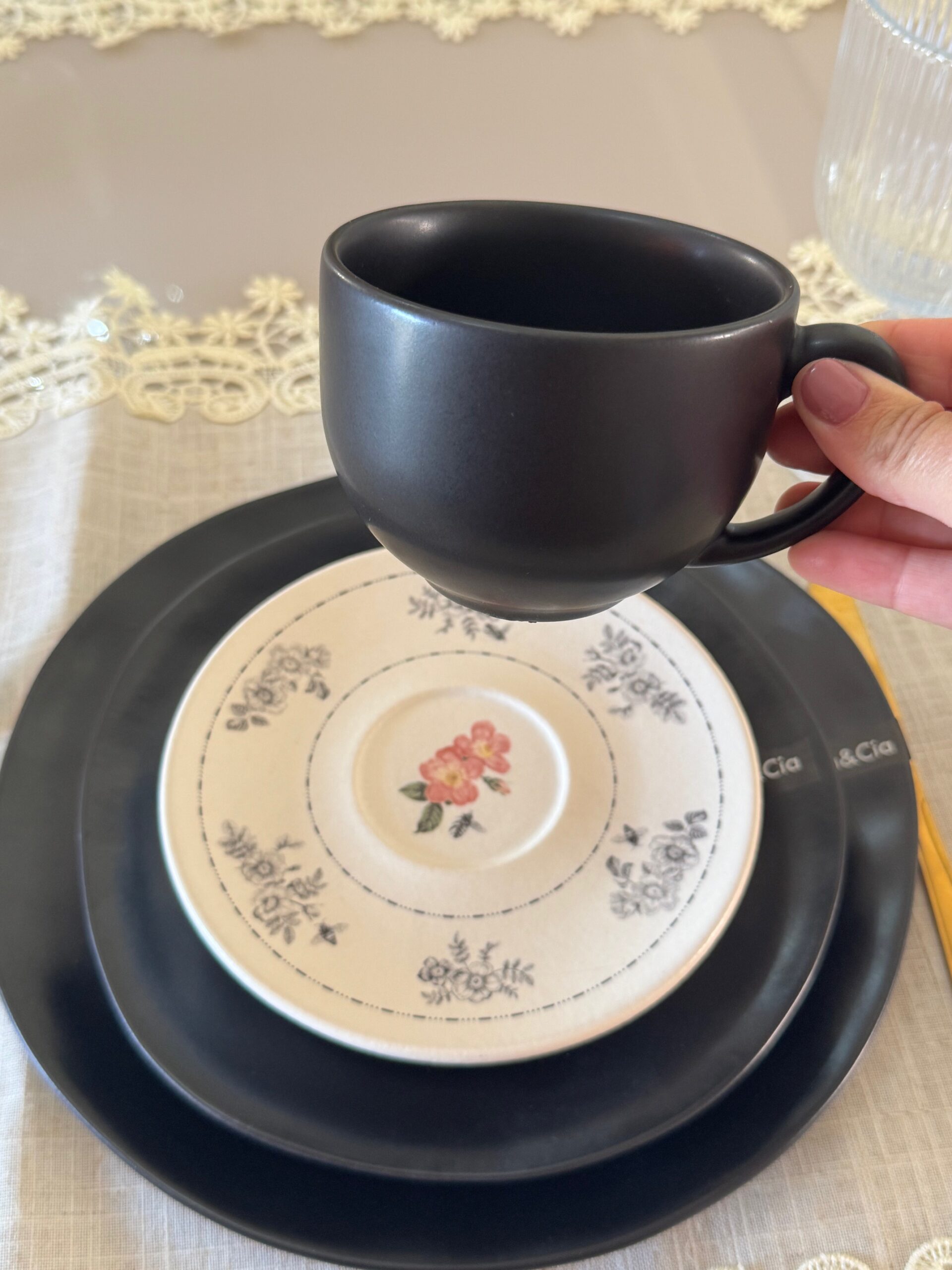 Xícara de chá com pires, na cor preta com acabamento fosco e pires com estampa delicada de flores. Feita de cerâmica de alta qualidade, perfeita para a sua mesa de café da manhã ou lanche.